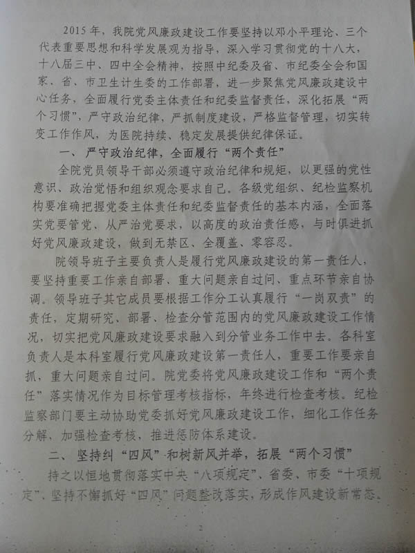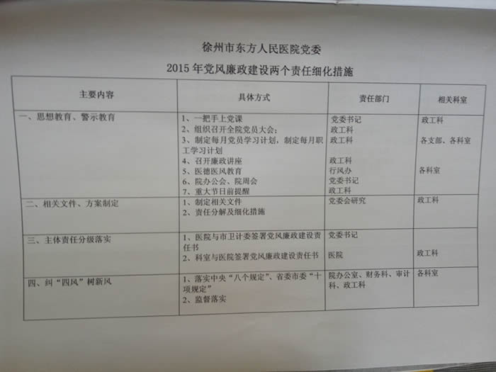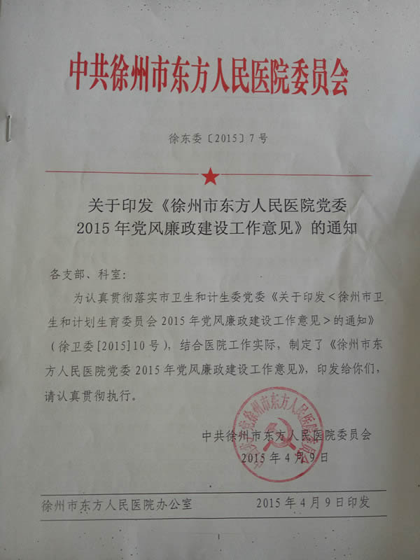 关于印发《徐州市东方人民医院医院党委2015年党风廉政建设工作意见》的通知
