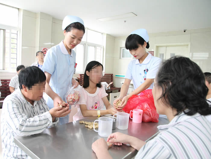 “每逢佳节倍思亲”又是一轮团圆月,又是一年中秋到。在这个特别的节日里,却有着这么一群人,她们孤独无助,享受不到和亲人团聚的那份喜悦,甚至比平常日子更多出一份失落与悲伤。为了让这些患者体会到家的温暖,感受到精神四科大家庭的快乐,精神四科医务人员为患者们举行了一个别开生面的中秋节。一大早就看到精神四科的工作人员忙碌的身影,布置着联欢会的现场,到处都洋溢着节日的气氛。随着歌声的响起活动正式开始了,患者们精心准备的节目,场面十分温馨,将活动不断推向高潮;有盲人击鼓、你来比划我来猜等好玩的游戏,患者们一边游戏,一边品尝医护人员精心为她们准备的食物,看着患者们嗑着瓜子,拿着水果,吃着月饼,每个人的脸上都笑开了花。大家都踊跃的参加,现场气氛非常活跃。患者、医护人员均笑容满面,通过互动、参与,医患之间的关系更为融洽。