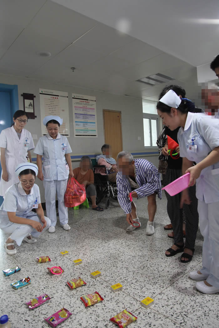 首先,主持人向大家宣讲活动流程、奖励设置与活动意义;接着,中医神志病科张主任带领医护人员向广大病员朋友进行中秋致辞;随后,活动在医护患大合唱《歌唱祖国》的红歌中拉开了帷幕,红歌回荡在病房内,大家脸上都洋溢着幸福的笑容。活动第二个环节是疾病相关知识有奖竞答,活动设置竞答区,题目为疾病相关知识,现场竞答,限时一分钟(不可用手机查询),答对者均可到工作人员处领取小礼品一份,大家的参与积极性非常的高,工作人员准备的30多道题,不一会的时间就被大家全部解答出来了。第三个环节是套圈活动,设置套圈区域,摆放4排奖品,参与者每人发5个套圈,凡是套中的礼品均为个人所得,这项活动大家参与的积极性非常的高,两个套圈区域大家欢呼声、叫好声、惋惜声此起彼伏,既有对套中的喜悦又有失手的惋惜,将活动推向了高潮。最后,中医神志病科孙红艳护士长和物质依赖科蒋璐繁护士长带领医护人员为患者送上爱心月饼,大家品尝着月饼,感受着过节的喜悦气氛,纷纷感谢医务人员为他们举办的这场活动。