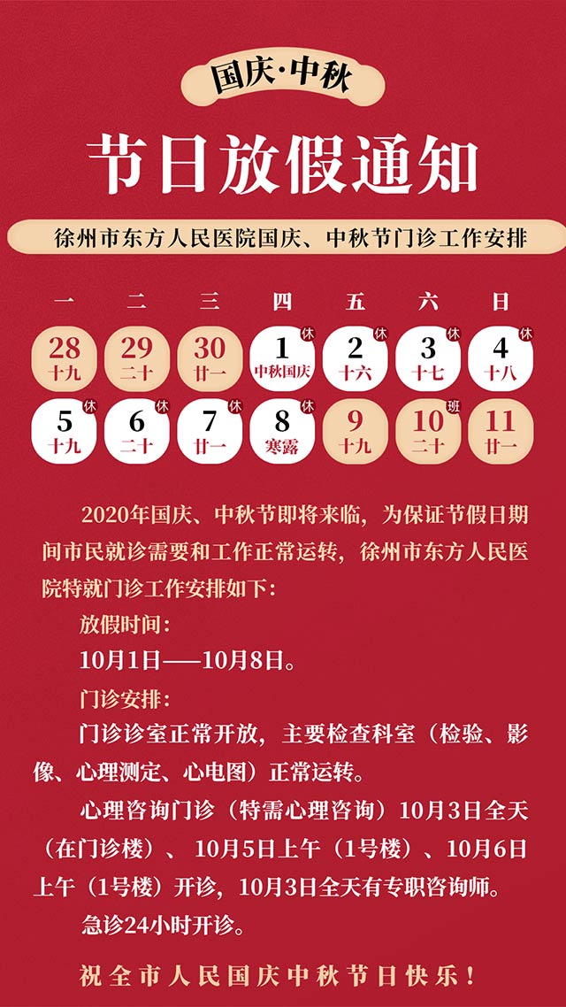 徐州市东方人民医院国庆、中秋节门诊工作安排