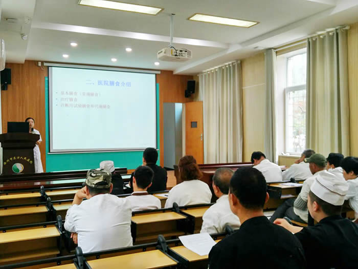 培训中,营养科夏主任着重强调以下几个方面,“从业规范(食堂应遵守的法律条例)”;治疗饮食制作、配餐、食堂管理规范、新技术标准学习;食堂从业人员的职业行为规范;日常加工操作规范及管理流程;手卫生规范等;膳食种类、治疗膳食规范要求等等。通过我院食堂现场拍摄的图片场景展示,图文并茂,更易加深理解与印象,培训要求全体从业人员应牢固树立“以病人为中心”的服务理念,增强一切为临床服务的责任意识、服务意识、规范意识和食品安全意识、质量意识,增强为临床服务的理念,为病人、病人家属及医院员工提供优质卫生安全的饮食服务保障。