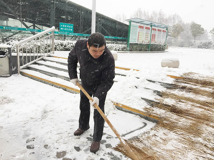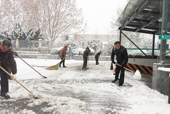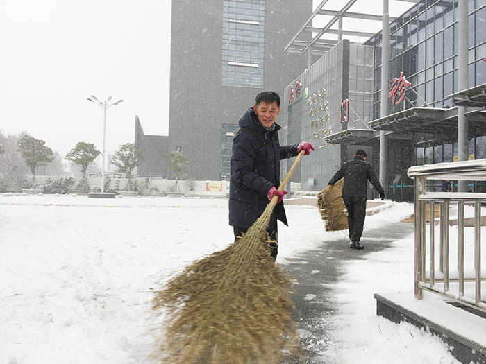 飘飘扬扬的雪花悄悄的落在每一个人的头发上,肩膀上,衣服上,冷风呼啸,但是每一位同志都没有丝毫退缩,依然干的热火朝天,经过近一个小时的奋战,很快就将医院的各个主干道清理出来,医院还在各个台阶部门放置了多个草垫,防止出行的人员滑到。