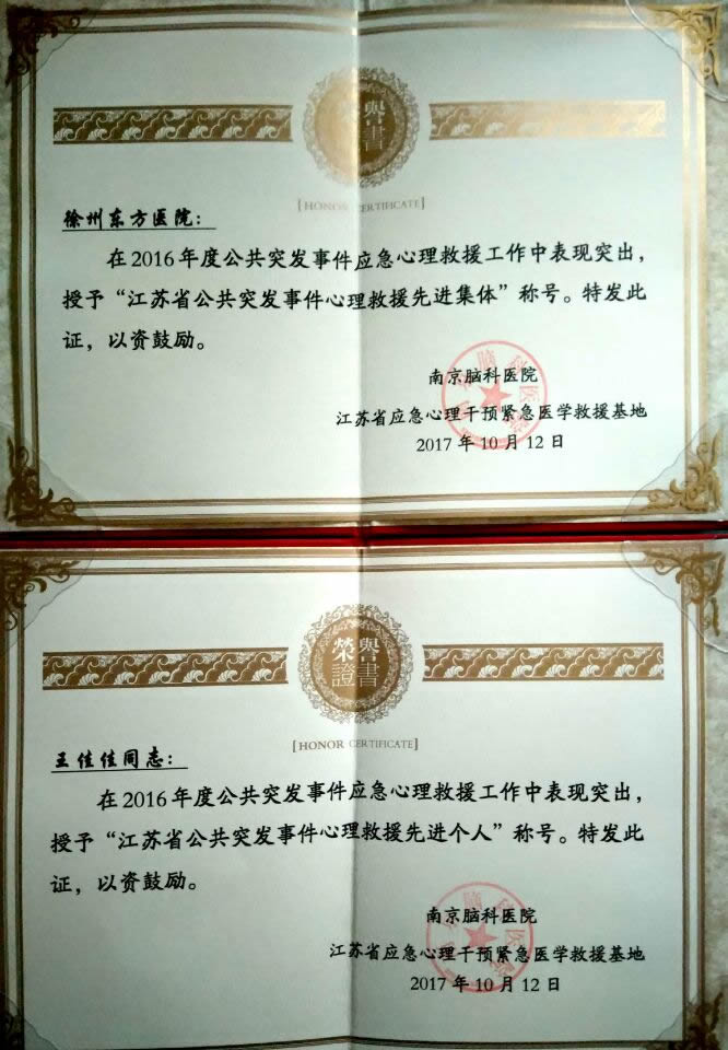 2017年10月13日我院心理研究所赵后锋所长、心理咨询与治疗中心主任助理王佳佳参加江苏省心理危机干预专题研讨会。开幕式上省卫计委应急办对2016-2017年度先进集体与个人进行了表彰,我院获得“江苏省突发公共事件心理救援先进集体”、王佳佳获得“江苏省突发公共事件心理救援先进个人”。研讨会上,王佳佳做了丰县幼儿园旁爆炸案心理救援工作交流。