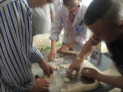 在之前的以“团圆”为主题讨论会中,病人们说好久没有吃饺子了,我院心理治疗师经讨论后一致决定将第八次的内容定为“包饺子”在向医院汇报并与病区沟通以及食堂联系得到同意后,工作人员提前一天准备好了肉馅和面粉,又与医院食堂确认了煮饺子的时间。一切准备就绪,4月28日下午,治疗师和助手们一起来到强制病房,先带着两组参加者进行了“我想有个家”主题活动,在引导中大家踊跃发言,活动中不时有肉香味飘散,病人们在听到包饺子的指令后迅速擦好桌子,洗好手准备面盆,勺子,水,大家分成了2组,每组都有人自告奋勇的和面,擀皮,包饺子,分工明确,团结一致,在音乐声中,气氛温馨而热烈。有的病人一边哼着歌,一边聊着家常,有的病人悄悄地对治疗师和咨询师说:“姐,我感觉像过年一样!”一位年纪最大的老爷子,一直坐在位子上擀皮,他小声地说:“回去后,我也得给孩子们包一顿饺子。”大家互相学习技巧,互相鼓励,表达着快乐、幸福感受,那种快乐真真切切,那种笑容发自内心。经过半个多小时,2组参加者一共包了400多个饺子,病人们小心翼翼地把饺子放在托盘中。