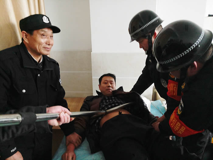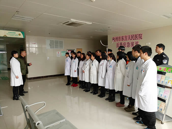 “一名就诊患者到心电图室做检查,在检查过程中,不配合医护人员涂抹酒精,瞬间性情暴躁,欲要伤人。 诊室人员见状立即按下手动报警器并报警。保安人员接警后,手持防暴钢叉、盾牌等装备,迅速集结赶往诊室。向病人犯病伤医与恐怖分子性质有别,反恐演练的对象应为恶意伤医伤人者扑去,将其制服后。在公安机关的配合下,将其扭送派出所,并协助公安机关保护现场、采集证据等。随后,医护人员负责抢救伤员,协助有关部门及时将伤员转移、抢救……”这就是徐州市东方人民医院组织的反恐演练场景。