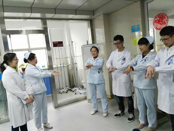 近日,根据我院制定的《2017年医院感染管理与传染病知识培训计划》 ,结合最近“人感染H7N9为主的重症呼吸道传染病病例数明显增多、病死率较高”的事件,感染管理科相关负责人及专职人员深入各个病区,着重讲述了手卫生的重要性及“三前两后”的洗手指征,并以“内、外、夹、弓、大、立、腕”七字顺口溜的形式总结出来,即生动又方便记忆,并现场与大家互动学习七步洗手法。