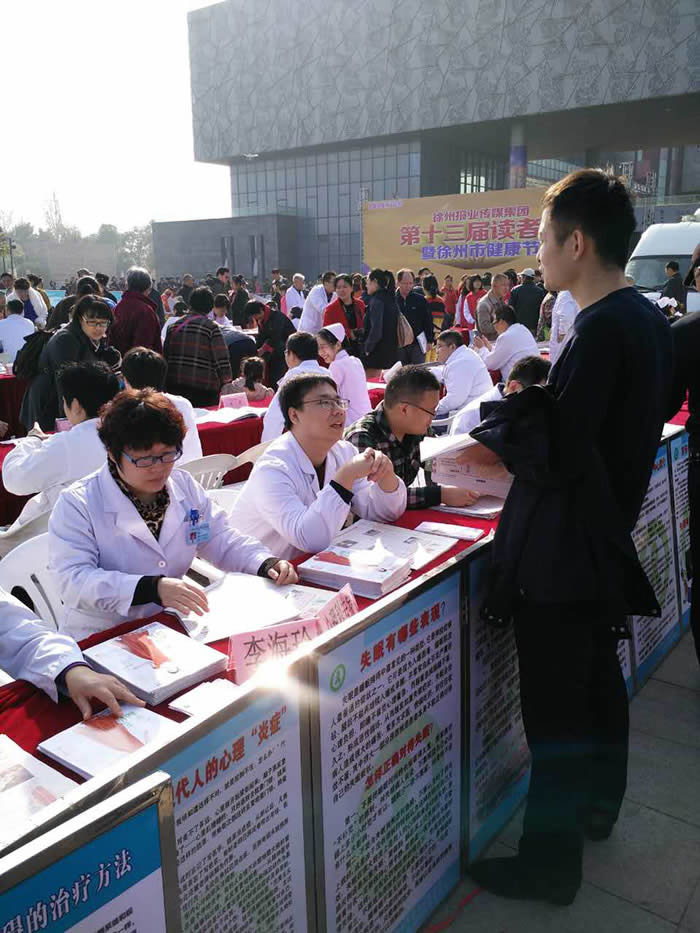 11月5日上午,徐州报业集团、市卫生计生委等部门在艺术馆北广场举办了声势浩大的“第13届健康节”义诊宣传活动,为广泛宣传《精神卫生法》和精神心理健康知识,呼吁社会各届共同关注心理健康、关心精神疾病患者、推动构建和谐社会环境,我院安排了精神科、心理科、睡眠障碍科、酒瘾治疗中心等专家来到义诊现场,为市民免费解答精神心理方面的咨询问题。义诊开始后,前来咨询的市民络绎不绝。“最近心情烦躁怎么办?”“长期睡眠不好怎么调理?”“高中的孩子学习压力大怎么缓解?”“家人十几年酗酒能治吗?”面对市民的困惑,医院专家们热心地接待市民的咨询,耐心向大家讲解精神健康知识、心理卫生注意事项,并针对市民的咨询提出合理的治疗建议,得到了市民的广泛好评。