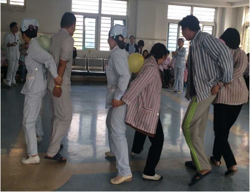 联谊会开始后,当女病人们在护士陪伴下来到精神一科和二科活动大厅的时候,男病人们手持气球站成两排,齐声欢呼:“欢迎,欢迎,热烈欢迎”,会场的气氛一下就欢腾热闹起来。护士们忙着为大家分发各种小食品,病人们边吃边看表演,有男女独唱、大合唱、诗朗诵、舞蹈一个比一个精彩,在男病人独唱的时候,几个能歌善舞的女病人热情的上场伴舞,歌声、笑声、掌声此起彼伏。在大家兴致最高的时候,护士们带着病人一起做趣味游戏、跳集体舞,活动大厅里洋溢着甜甜的笑声、暖暖的情谊……