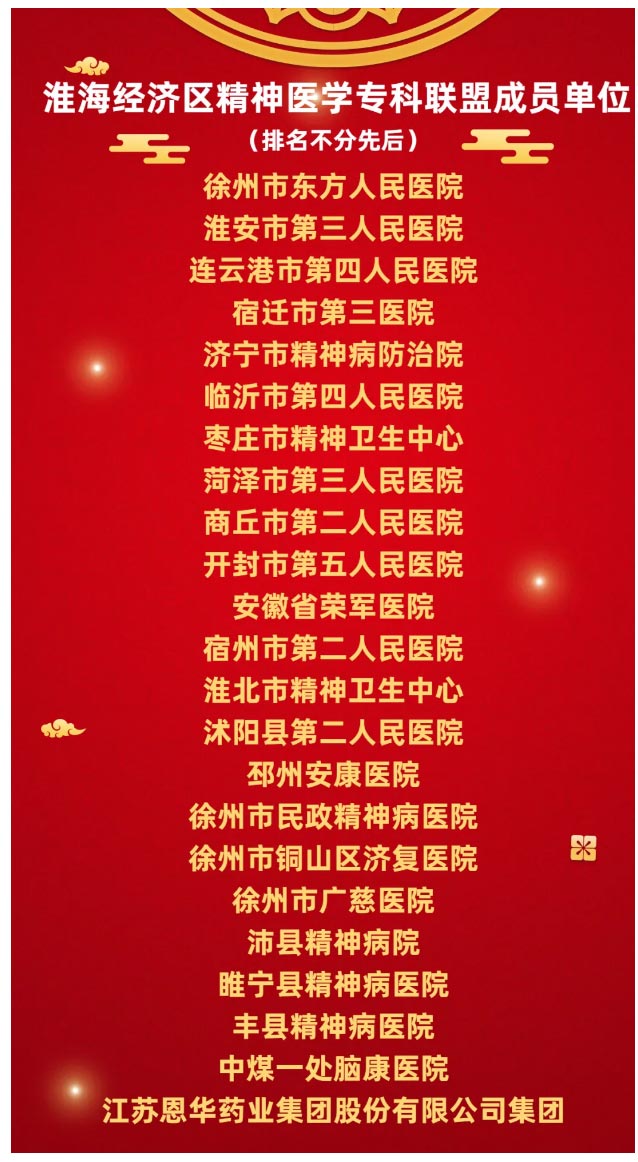 随后,杨永杰院长宣读首届淮海经济区精神医学《专科联盟章程》,宣布:徐州市东方人民医院为首届理事长单位,淮安市第三人民医院等12家医院为副理事长单位,沭阳县第二人民医院等2家医院为常务理事单位,徐州市铜山区济复医院等8家单位为理事单位。