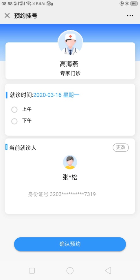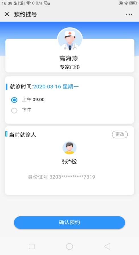 6.在“就诊时间”一栏选择上午或下午,确定预约时间段。