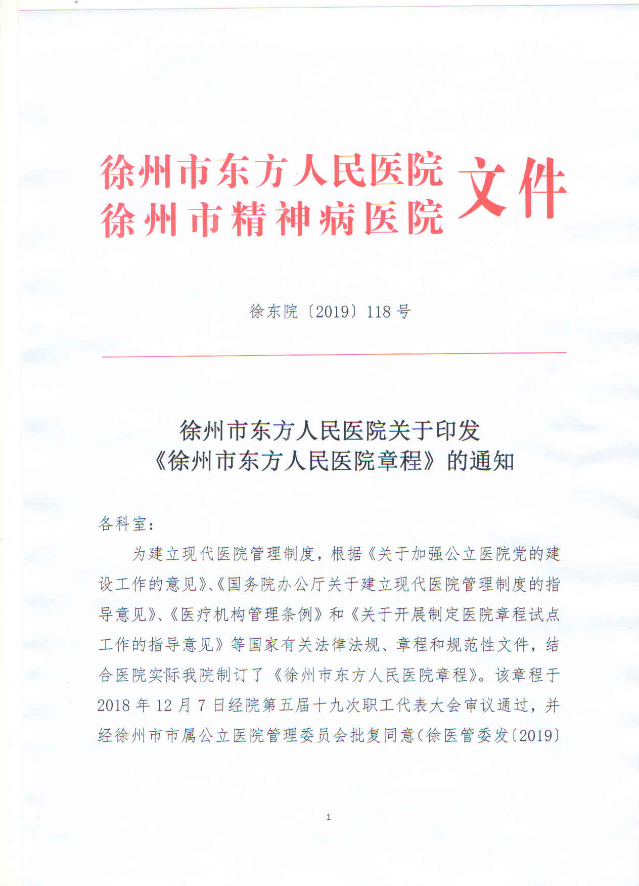 日前,经徐州市市属公立医院管理委员会同意,市东方人民医院上报的《徐州市东方人民医院章程》(送审稿)被批复通过。