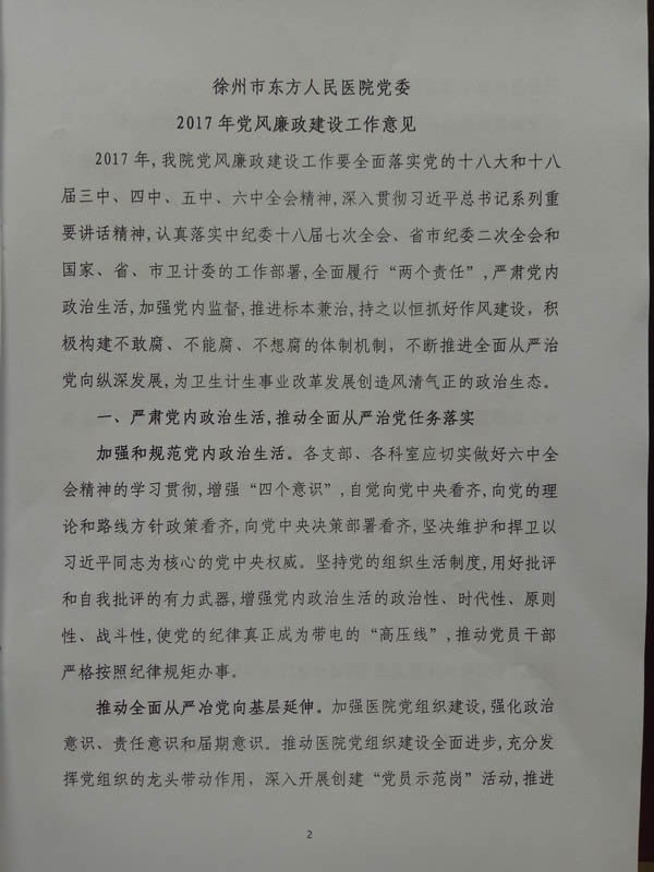 关于印发《徐州市东方人民医院2017年党风廉政建设工作意见》的通知