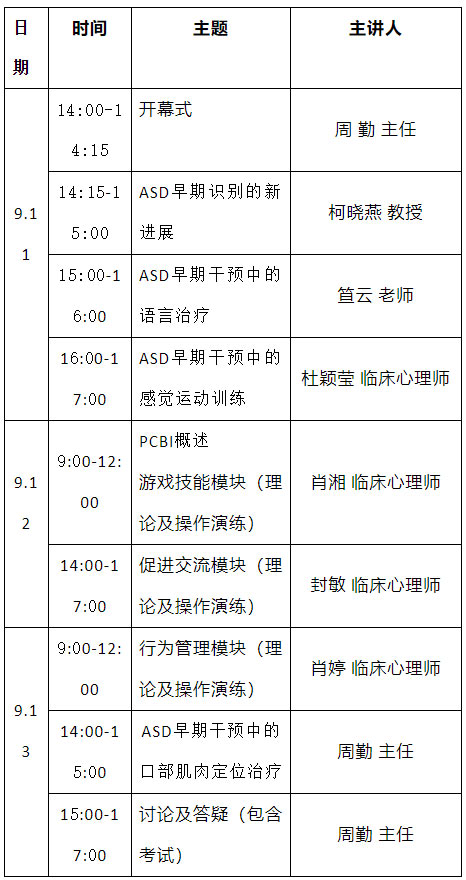 2020年9月11日-9月14日将在徐州由南京脑科医院和徐州东方医院联合主办《孤独谱系障碍早期发现早期干预新技术培训班》,届时将为大家带来PCBI超早期干预技术的相关培训。本次培训为江苏省继续医学教育项目(项目号:2020010309008),培训合格的学员将获得I类学分5分。欢迎广大儿童精神科、精神科医师、儿童保健、儿童心理、儿童康复等相关专业人员参加。
